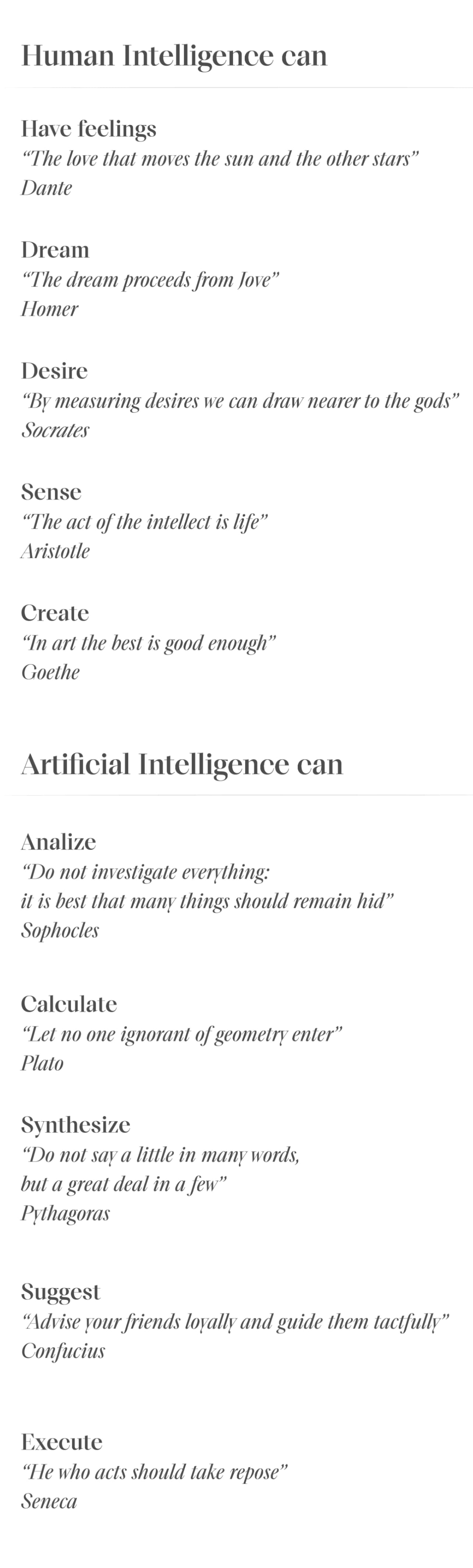 We believe in the importance of a fair humanistic relationship between the qualities that nature gifted us with and this new intelligence that we are building through technology. We should never forget our soul. And perhaps artificial intelligence should have human sensitivity.»