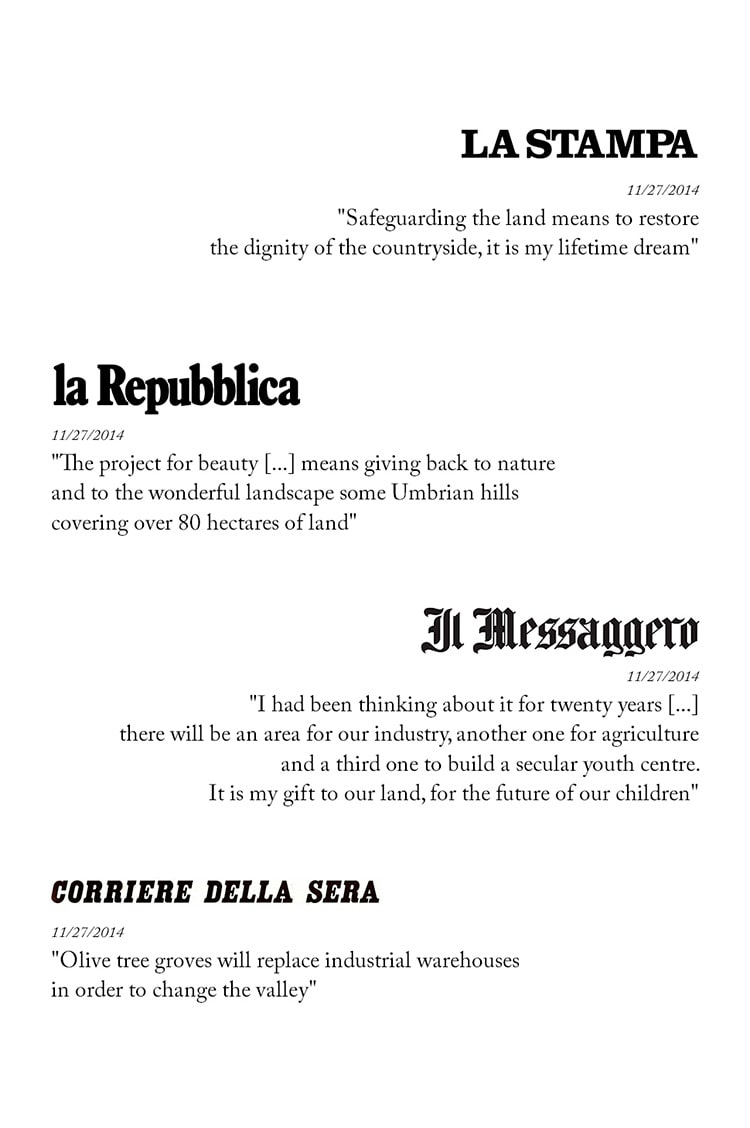 The industrial periphery of Solomeo, which was recently redesigned with the Project for Beauty, has proven that all this is achievable. The road crossing those outskirts has become a tree-lined boulevard in the middle of a park and it has therefore been suitably renamed: it used to be "via dell’Industria" (Industry Street) and now it is called "via Parco dell’Industria" (Industrial Park Street).
