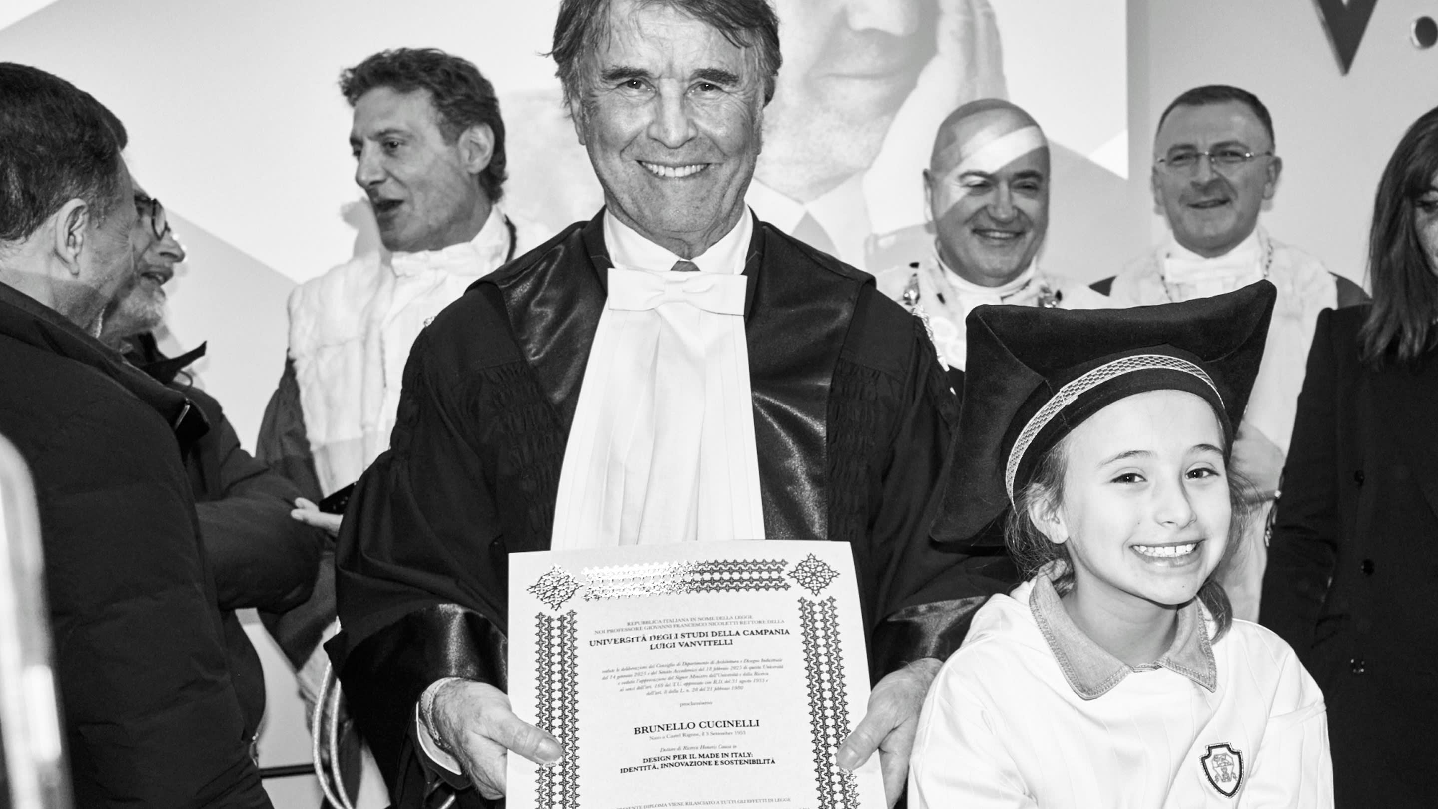 From left, Prof. Arch. Alessandra Cirafici, Rector of the University of Campania Prof. Gianfranco Nicoletti, Rector of the University of Perugia Prof. Maurizio Oliviero, Brunello Cucinelli, Minister of University and Research of the Italian Republic Hon. Anna Maria Bernini, Rector of the University of Naples Parthenope Prof. Antonio Garofalo, Rector of the University of Naples L’Orientale Prof. Roberto Tottoli, Prof. Ornella Zerlenga, Director of the Department of Architecture and Industrial Design