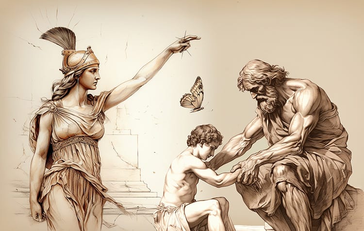 Prometeo modella il primo uomo cui Atena dona l’anima, ponendo sul suo capo una farfalla [in greco antico Psyche], illustrazione realizzata con strumenti di Generative AI