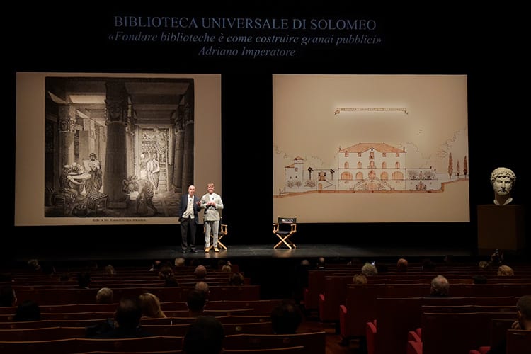 E ci siamo chiesti, un giorno in cui eravamo particolarmente euforici: «come potremmo continuare questo discorso nobile, cosa ci piacerebbe donare al mondo per i prossimi mille anni, sentendoci custodi del Creato»? Io sono un imprenditore di mestiere, Massimo è un architetto, e tutte queste cose per noi rappresentano il piacere di tentare ancora qualcosa di nuovo e di bello per l’umanità, come una serie di doni destinati a rimanere nel tempo. L’idea del tempo ci ha portato indietro, ad Adriano Imperatore, e ancora più lontano, ad Alessandro Magno, tutti e due uomini che seppero coniugare i sogni con le azioni a beneficio del mondo; ricordavamo che entrambi amavano i libri; Adriano pensava che chi fonda una biblioteca è come chi costruisce un granaio per lo spirito, e Alessandro aveva come uno dei più importanti generali Tolomeo, che nella nuova città di fondazione Alessandria volle edificare la più famosa biblioteca del mondo. E allora ci siamo detti: perché, pur nella nostra piccolezza, non seguire il sogno di quei grandi, perché non realizzare qui a Solomeo, quasi come una cosa necessaria e desiderata, una grande biblioteca, che grazie all’universalità del pensiero degli autori dei libri che la arricchiranno possa essa stessa perciò essere immaginata come “universale”?