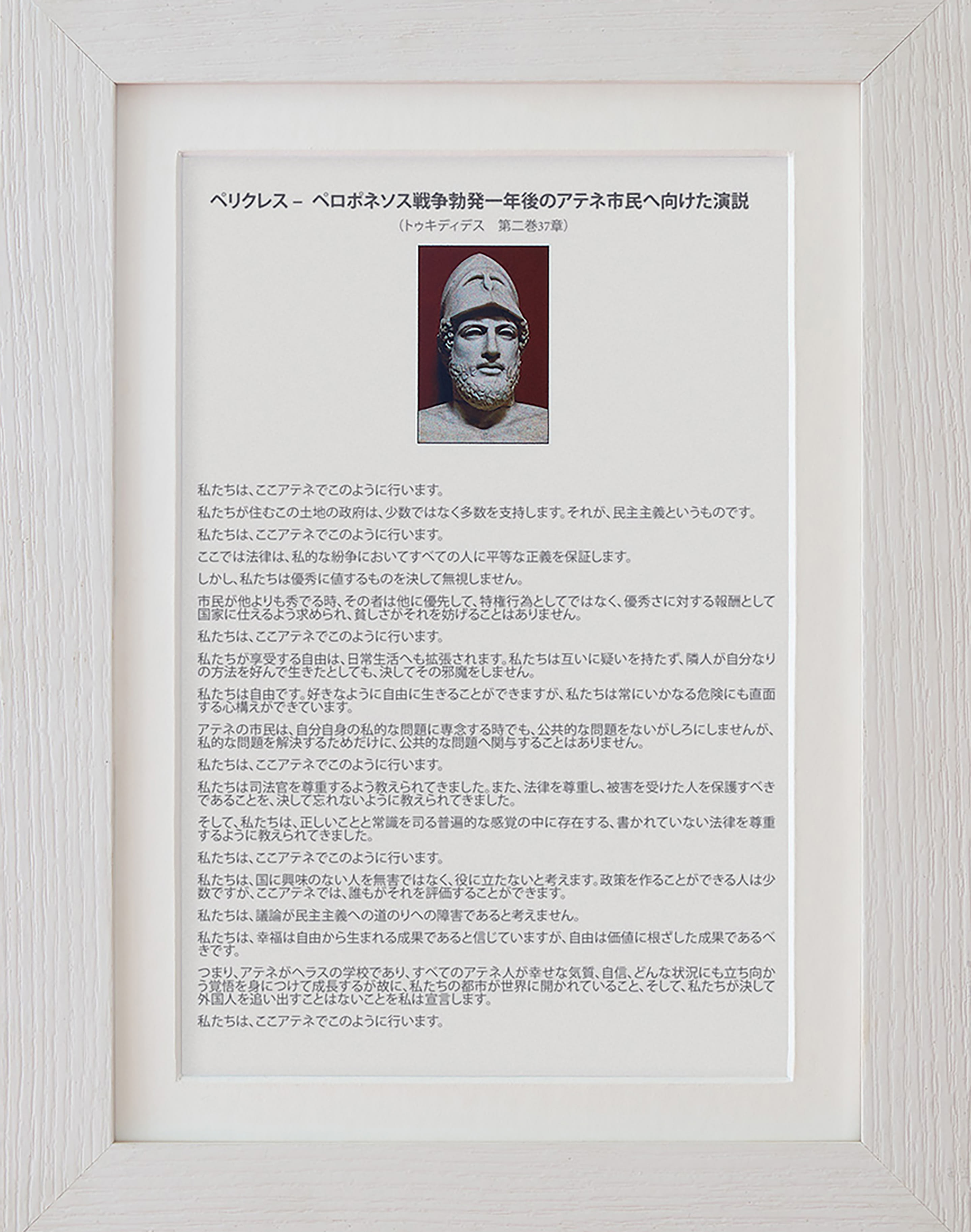 「私はこれまで、紀元前431年にペリクレスがペロポネソス戦争の戦没者追悼のためにアテナイ人へ向けて行なった演説の中に、正しい道徳的指針を見出してきました。尊厳と敬意を携えて人生を生きるための模範。私たちの事業の倫理的・人間的基盤を構築するための普遍的な考え方です。」