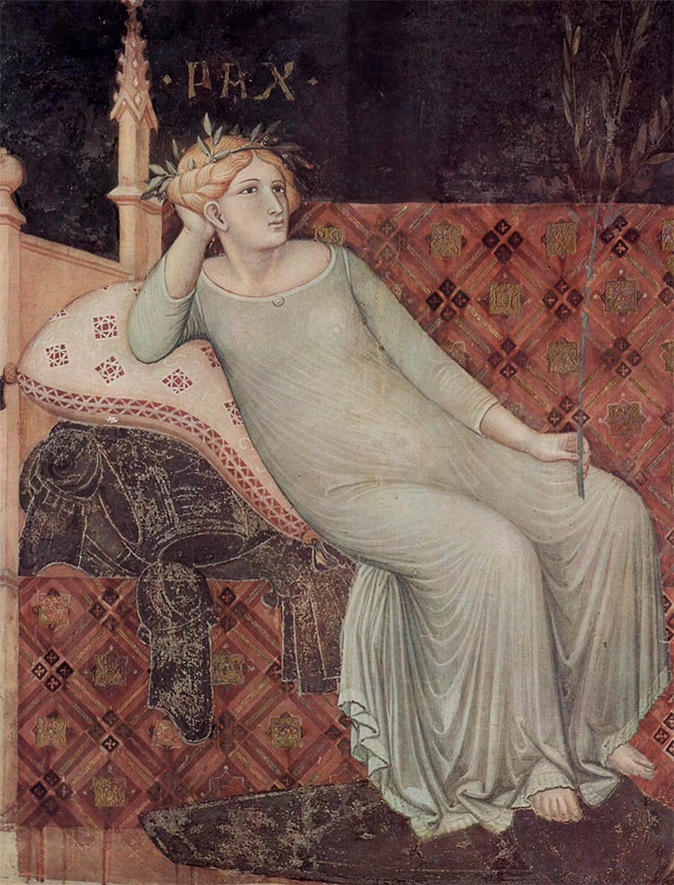 シエナ、プッブリコ宮殿、「Allegoria del Buon governo(善政の寓意)」、 「LA PACE(平和)」 (アンブロージョ・ロレンツェッティ、14世紀) © The Picture Art Collection / Alamy Foto Stock
