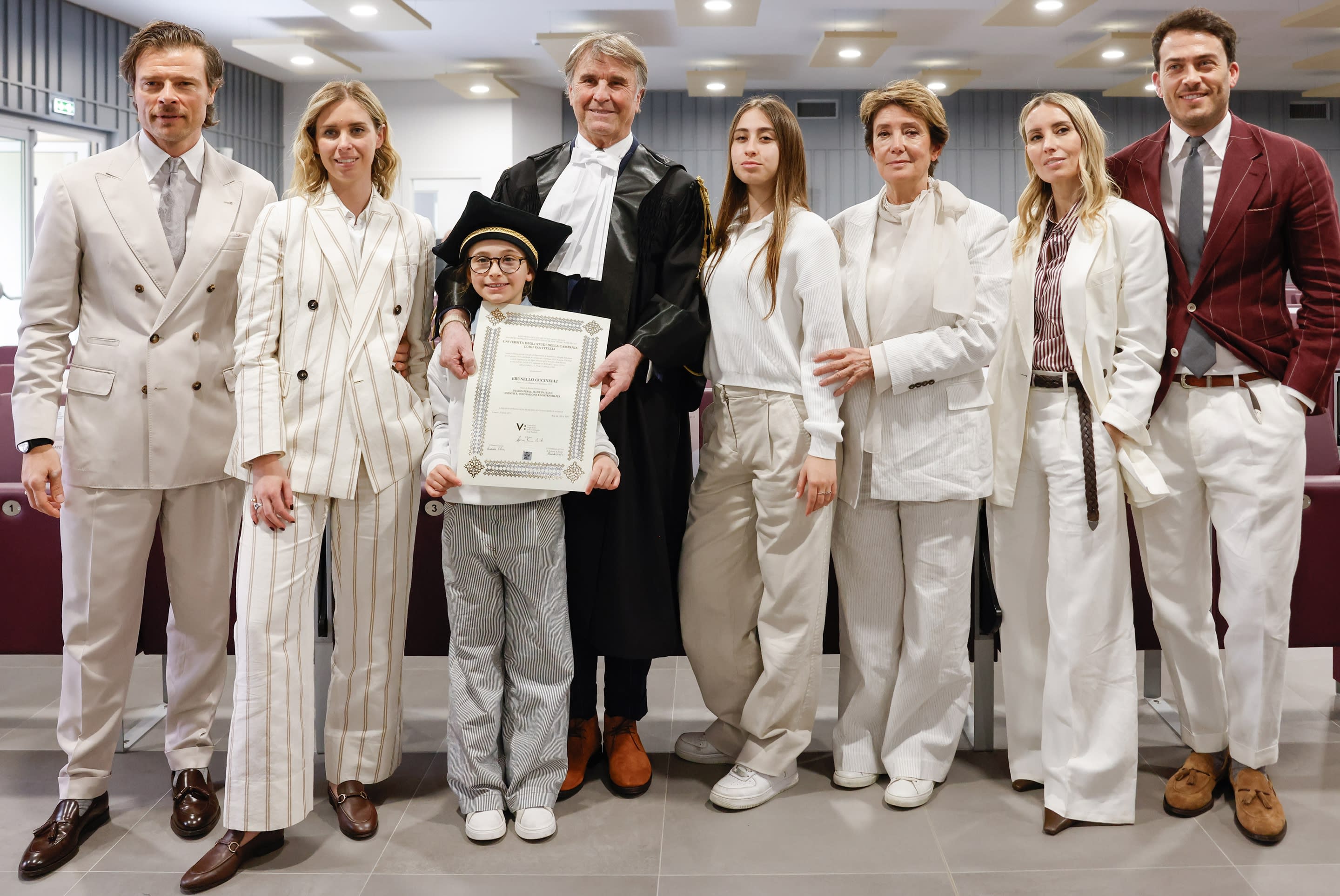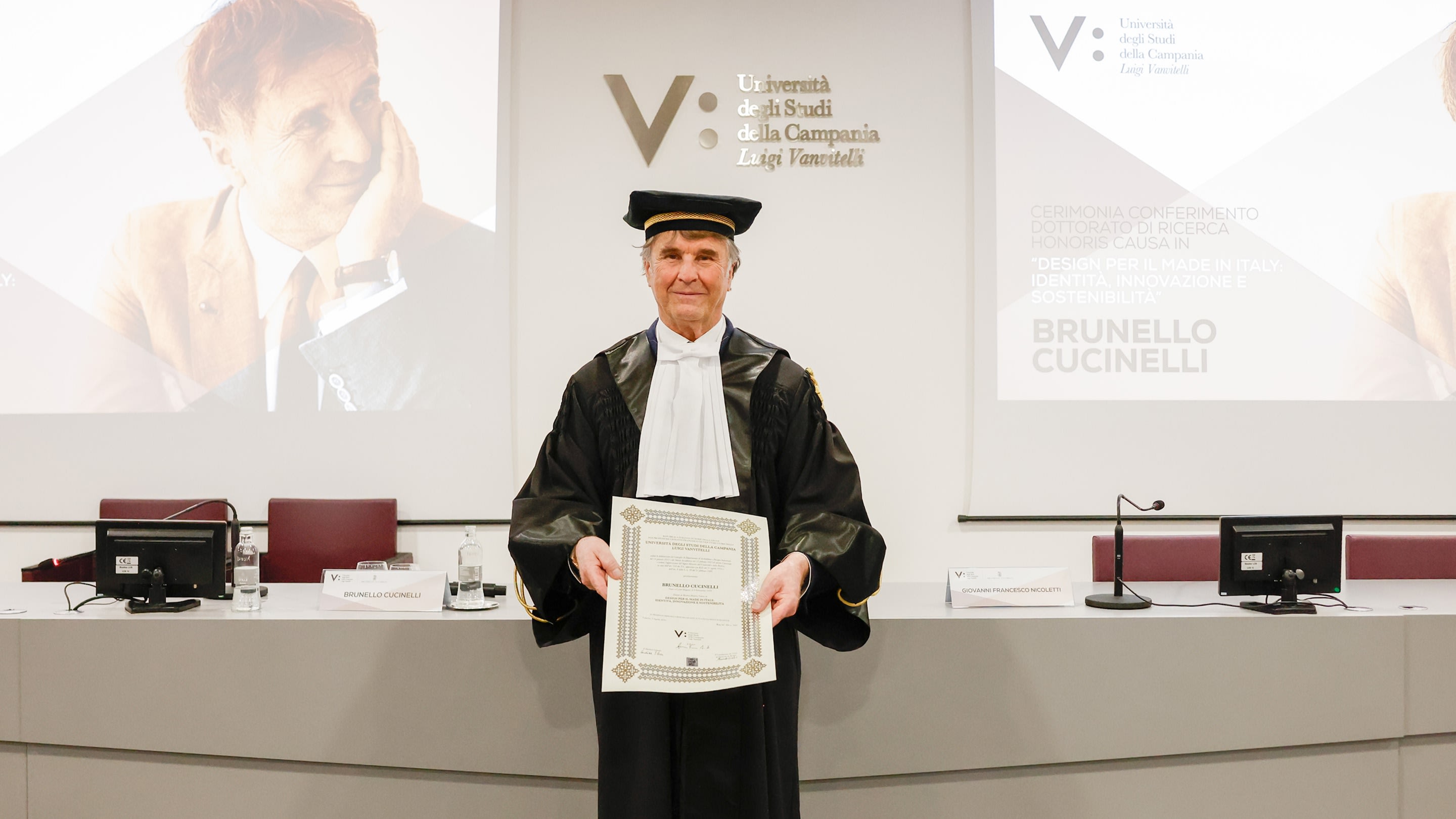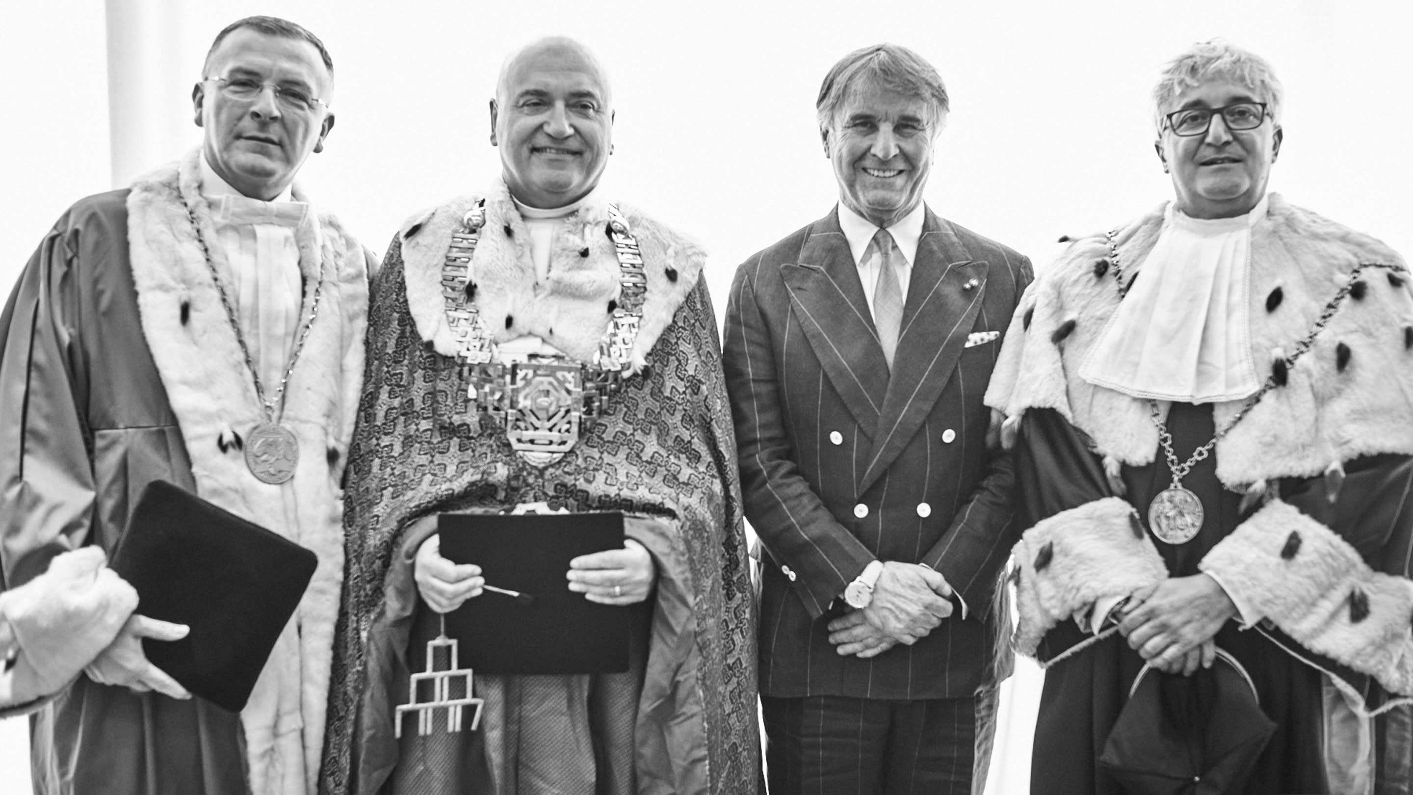 左から、建築学教授アレッサンドラ・チラフィチ、カンパニア大学学長ジャンフランコ・ニコレッティ教授、ペルージャ大学学長マウリツィオ・オリヴィエロ教授、ブルネッロ・クチネリ、イタリア共和国大学・研究大臣アンナ・マリア・ベルニーニ閣下、ナポリ・パルテノペ大学学長アントニオ・ガロファロ教授、ナポリ東洋大学学長ロベルト・トットリ教授、建築・工業デザイン学部長オルネッラ・ゼレンガ教授